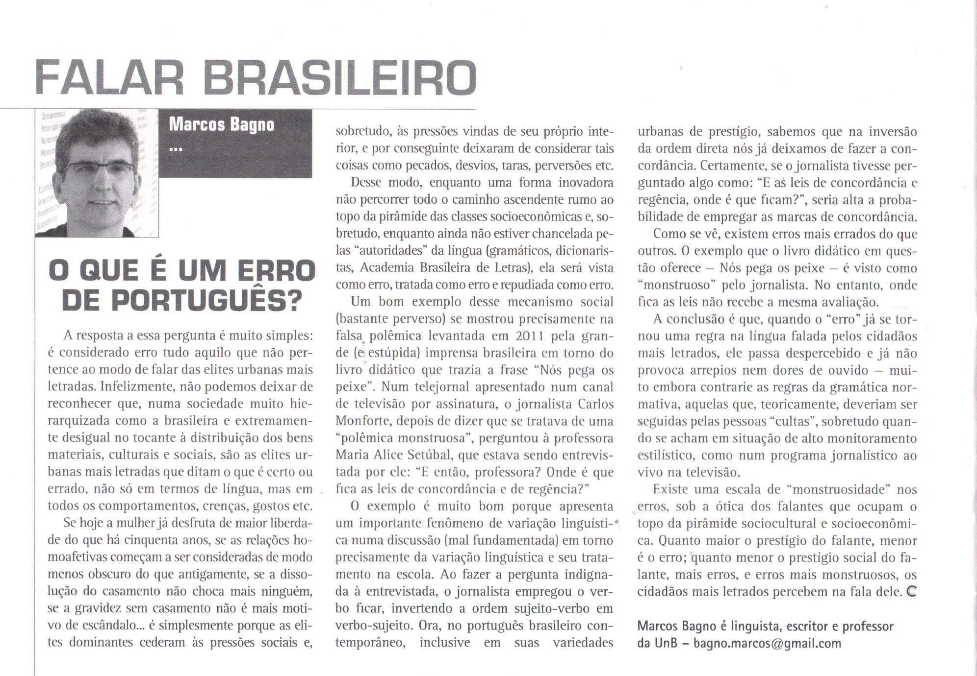 Texto publicado na Revista Caros Amigos no qual o professor Marcos Bagno explica em que consiste a noção de "erro" no uso da língua portuguesa.