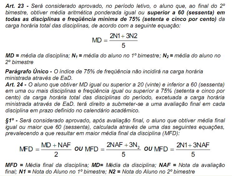 Fórmulas para calcular a média das notas dos bimestres e semestres.